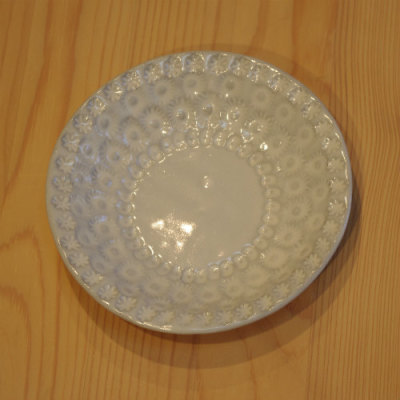 アンティークレースをイメージしたお皿です。模様はオリジナルの「印」を作り、それを押しています。色は黒土に白い釉薬をかけた、ツヤのある「ホワイトグレー」。サイズ:Φ12.5〜13×高さ2.5cm よしざわ窯 陶器 益子焼 日本製