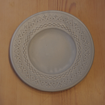 お皿のリムの部分に、パターンのモザイク模様を施した大きめなお皿です。リム部分が広く、存在感があります。色は黒い土にツヤのない「ホワイト」をかけているので「ホワイトグレー」よりもシックな感じのグレーです。サイズ:直径21.5cm×高さ3cm よしざわ窯 陶器 益子焼 日本製